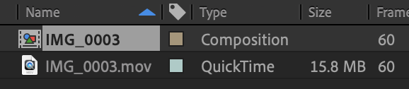 그러면 아래 사진과 같이 영상 크기와 설정에 맞춰서 새로운 컴포지션이 생성이 된다.